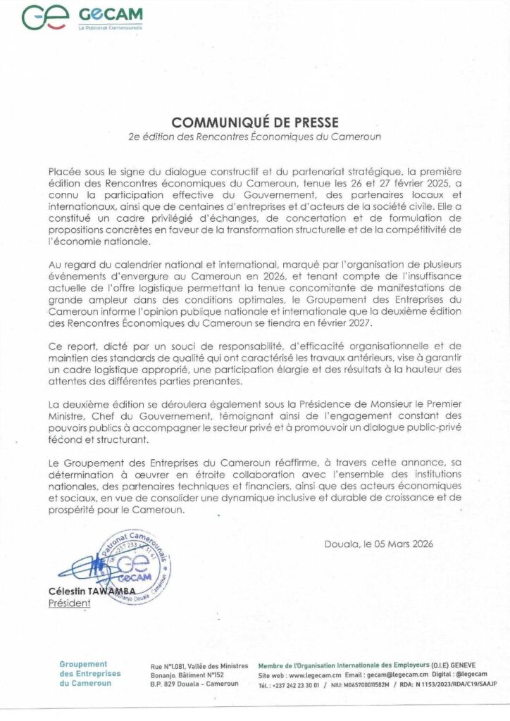 (BFI) – Au regard du calendrier national et international marqué par l’organisation de plusieurs évènements d’envergure au Cameroun en 2026, le groupement des entreprises du Cameroun (Gecam) informe l’opinion publique nationale et internationale que la deuxième édition des Rencontres Economiques du Cameroun (REC) se tiendra en février 2027.